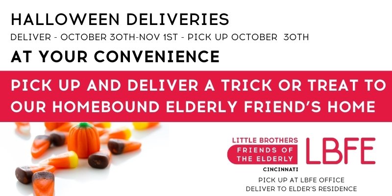 Pick up treats from our office, 5530 Colerain Ave. Cinci, OH 45239, and deliver to the homes of our elderly friends